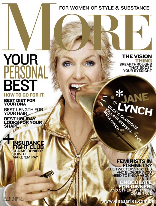 Depois do ensaio sensual de Dianna Agron, Cory Monteith e Lea Michele, foi a vez de mais uma atriz de Glee ser clicada em fotos “calientes”: Jane Lynch. É isso mesmo, a intérprete da perigosa Sue Sylvester é capa e recheio da edição de novembro da revista More.